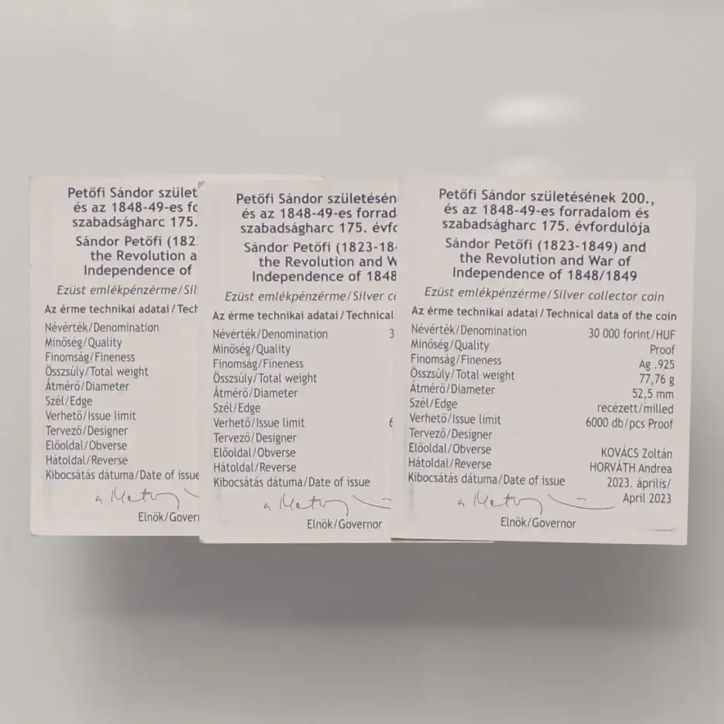 Megnevezés: 2023 Petőfi - Szabadságharc 30.000 forint emlékérme + certi LOT (3 db)