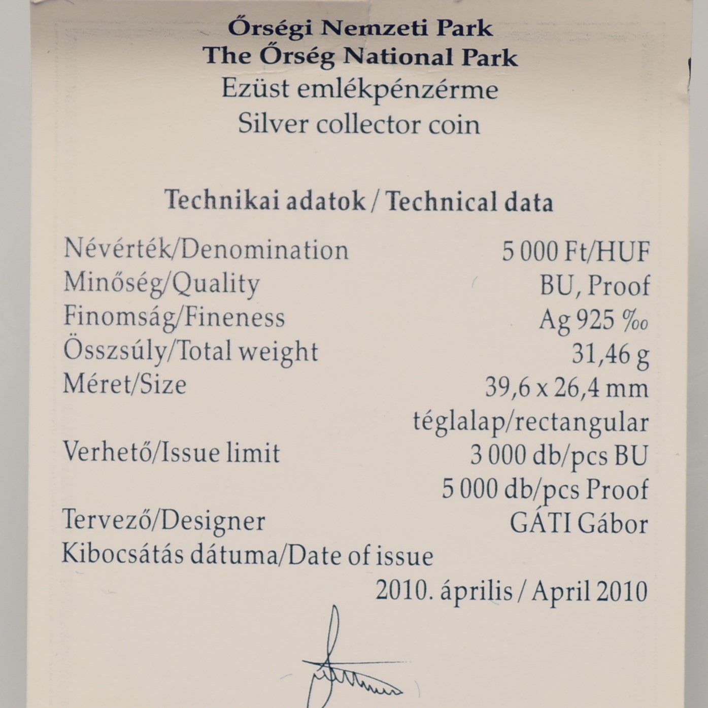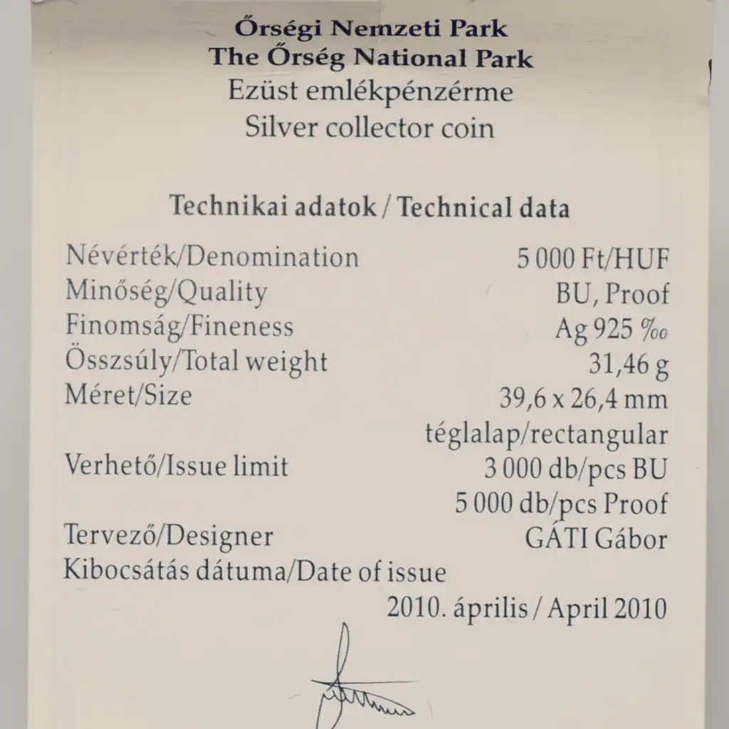Megnevezés: 2010 Őrségi Nemzeti Park ezüst 5000 Forint PP + certi