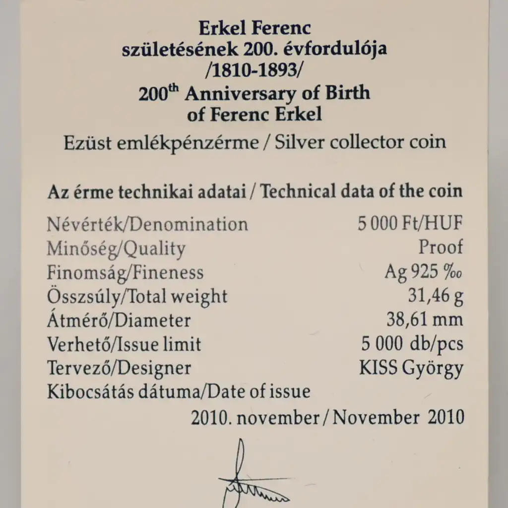 Megnevezés: 2010 Erkel Ferenc ezüst 5000 Forint PP + certi