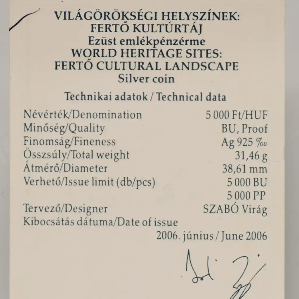Megnevezés: 2006 Fertői Kultúrtáj ezüst 5000 Forint PP + certi