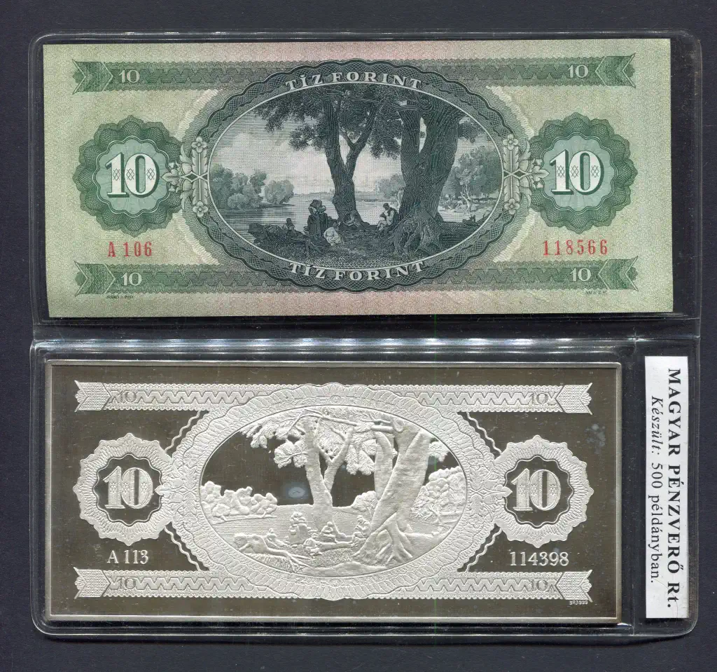 Megnevezés: 1975 MNB 10 Forint UNC + színezüst bankjegyveret (7 uncia)