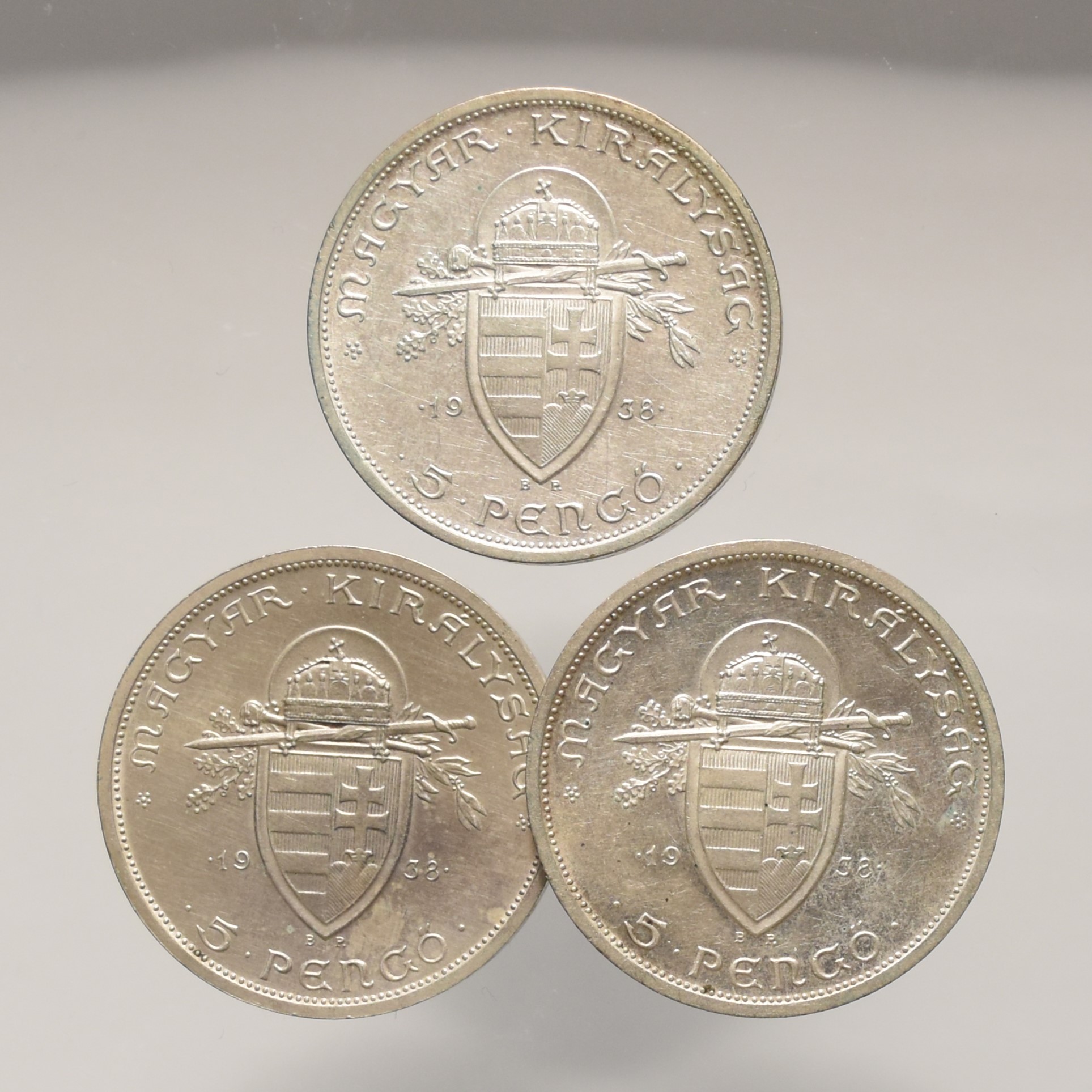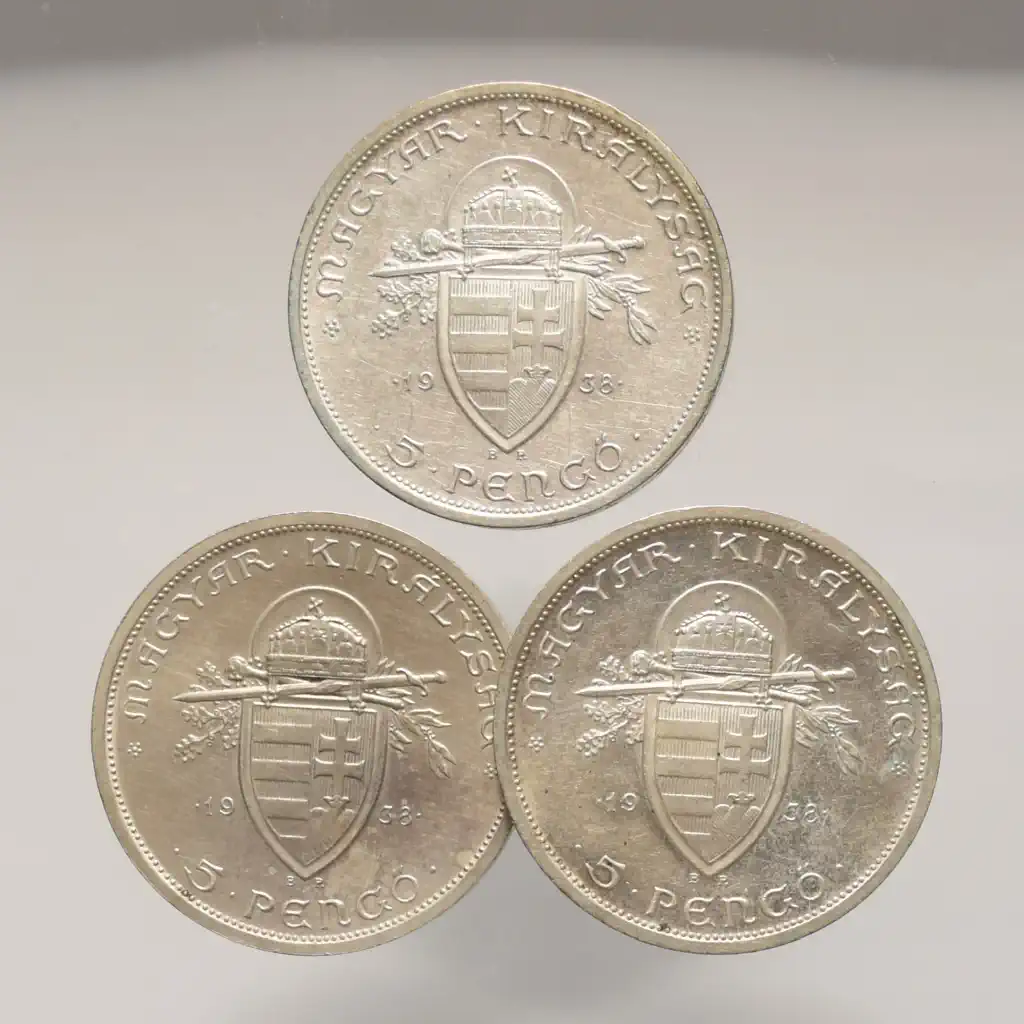 Megnevezés: 1938 szép Szent István ezüst 5 Pengő LOT (3 db)