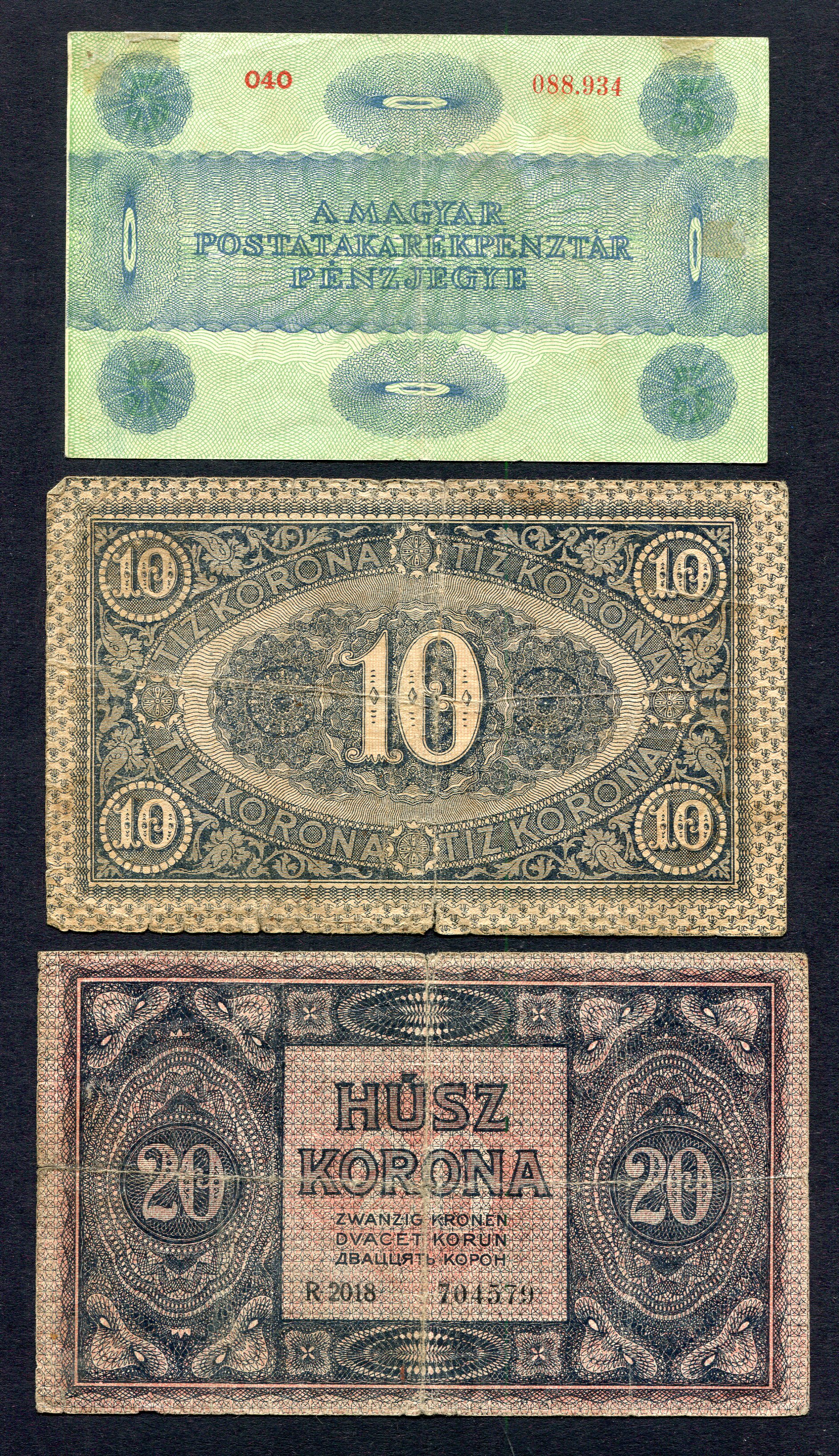Megnevezés: 1919 5 korona (VF) + 10 - 20 korona (F) (3 db)