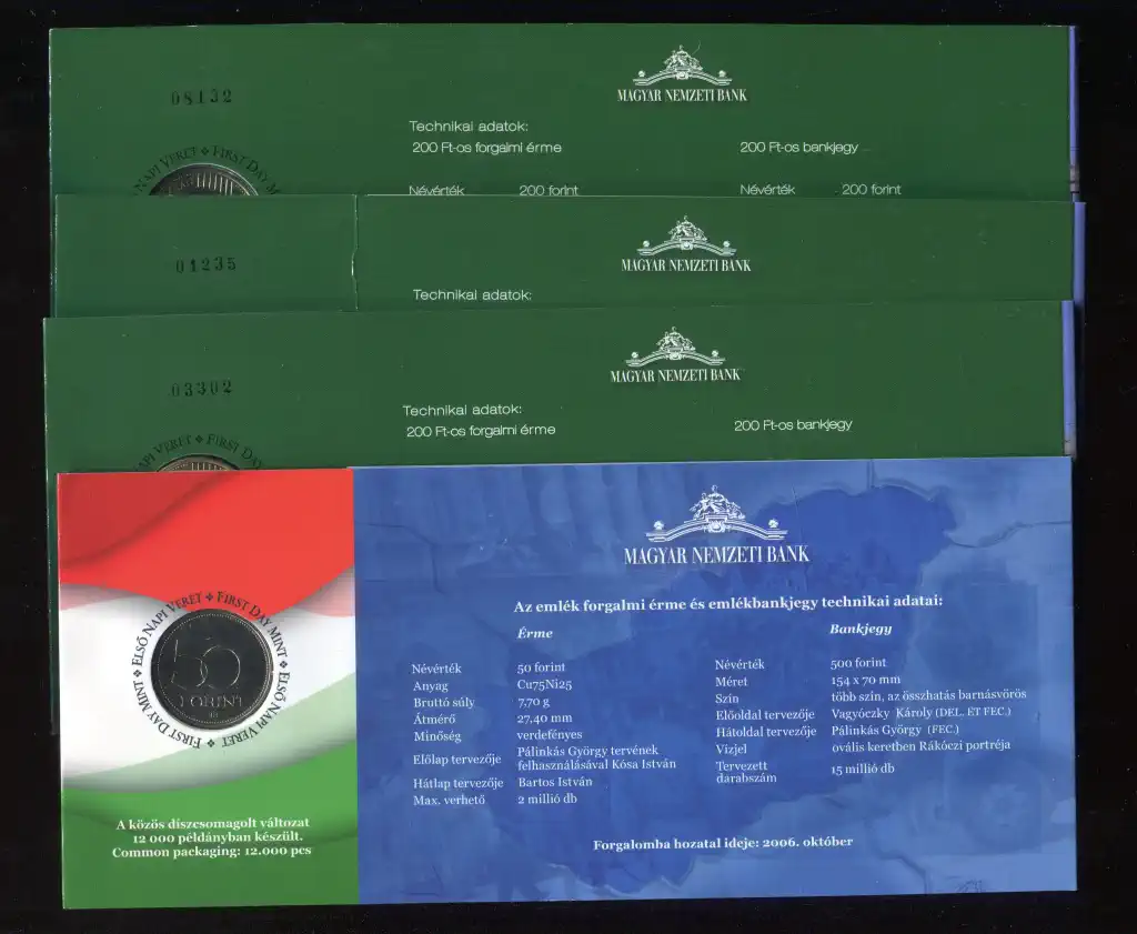 Megnevezés: 2009 200 Forint érme és bankjegy (3 db) + 1 db 2006 50 és 500 Forint bliszter LOT (4 db)