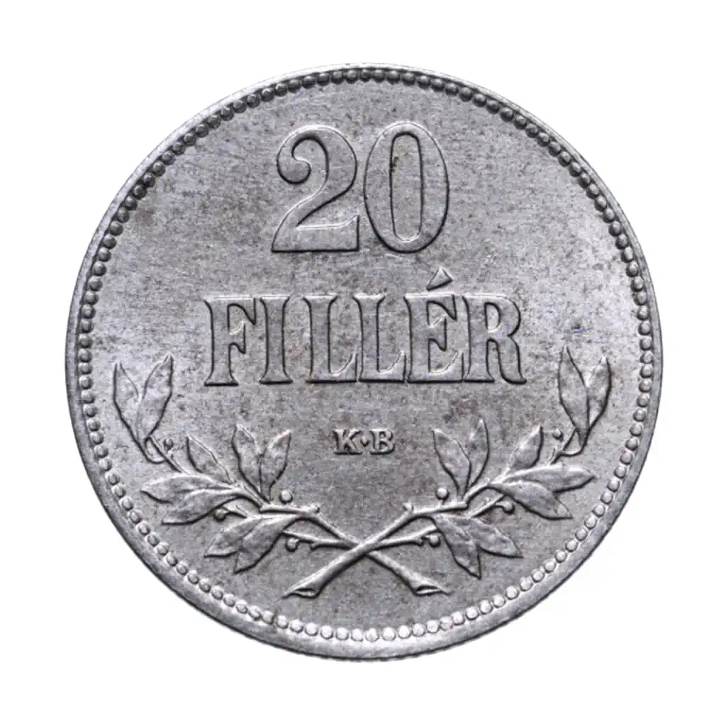 Rv: 20 / FILLÉR / K•B alul két babérág /unten zwei gekreuzte Lorbeerzweige/ pereme recés /geriffelter Rand/