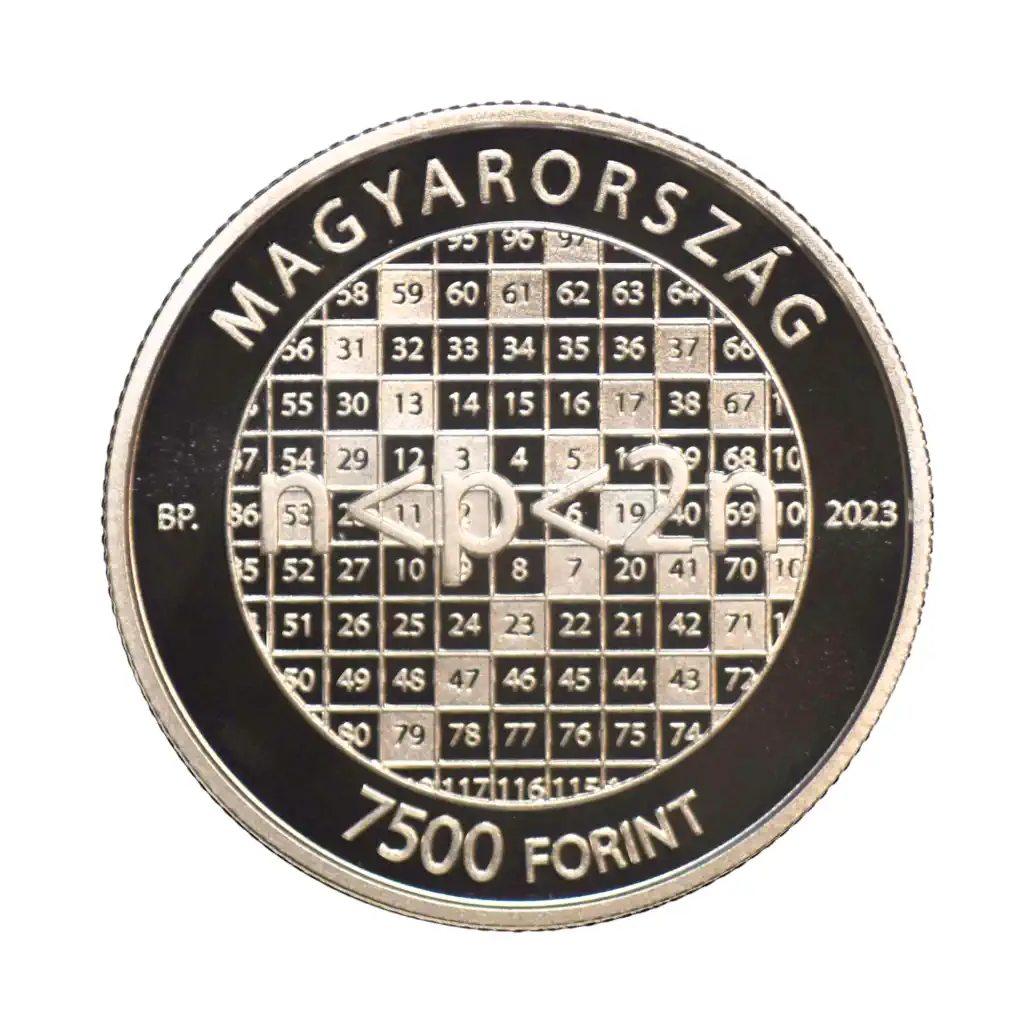 Av: körvonallal határolt középmezőben „n < p < 2n” képlet, hátterében prímspirál. Az előlap szélén köriratban, fent „MAGYARORSZÁG” felirat, lent „7500” értékjelzés és „FORINT” felirat, bal oldalon „BP.” verdejel, jobb oldalon „2023” verési évszám.