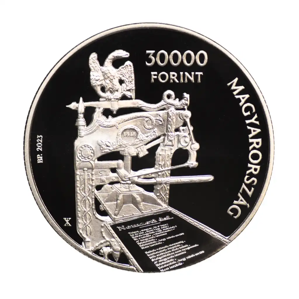 Av: a Landerer és Heckenast nyomda nyomdagépe és a kinyomtatott Nemzeti dal első két versszaka a peremre kifuttatva. Fent két sorban „30000” értékjelzés és a „FORINT” felirat. Köriratban bal oldalon „BP.” verdejel és „2023” verési évszám, jobb oldalon „MAGYARORSZÁG” felirat, A nyomdagéptől balra lent Kovács Zoltán tervezőművész mesterjegye.