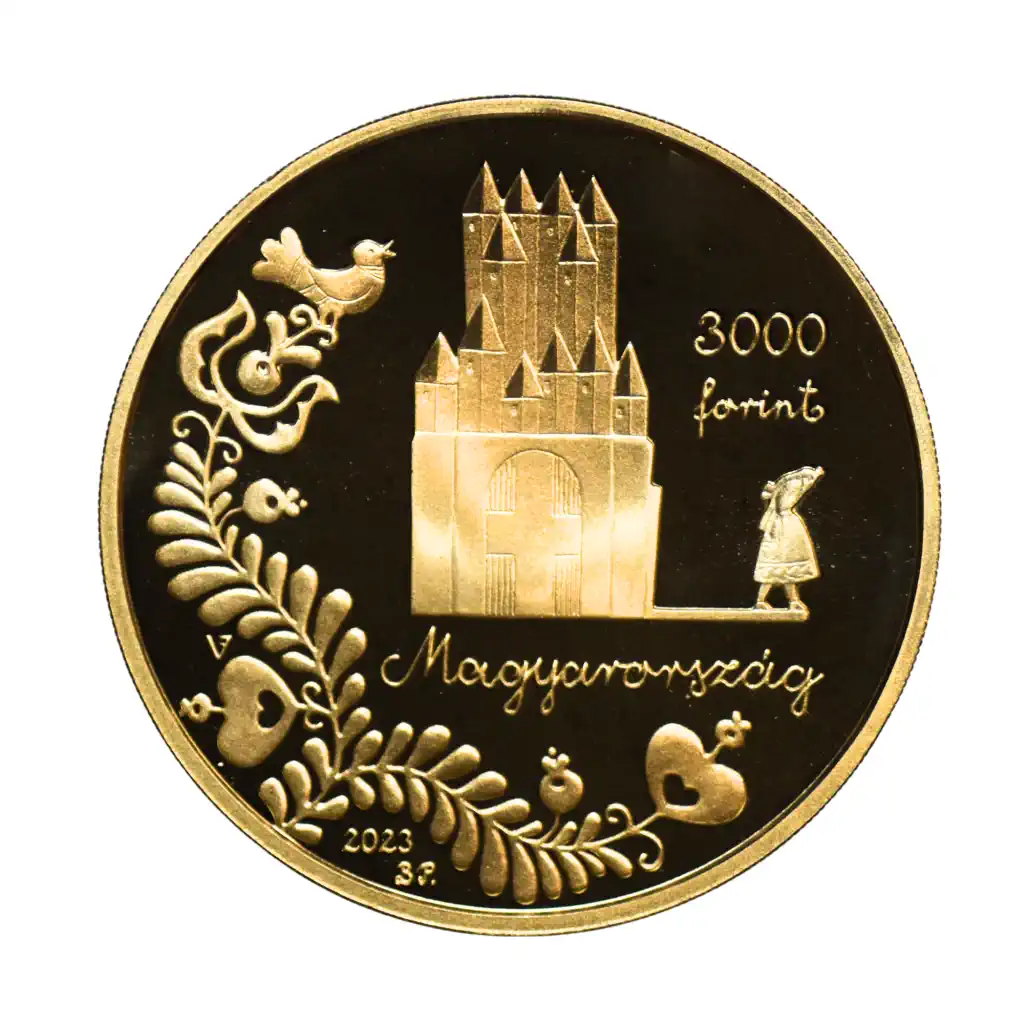 Av: középmezőben a népmesei királyi vár és az elűzött királylány motívuma, ettől jobbra két sorban kézírással „3000” értékjelzés és „forint” felirat, a motívum alatt kézírással „Magyarország” felirat. Az előlap bal oldali és alsó részén stilizált népművészeti motívum, ettől balra Vékony Fanni tervezőművész mesterjegye, balra lent két sorban kézírással „2023” verési évszám, és „BP.” verdejel.