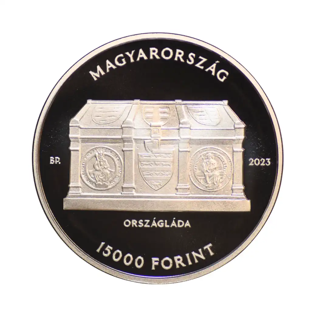 Av: díszes láda, alatta „ORSZÁGLÁDA” felirat. Köriratban fent „MAGYARORSZÁG” felirat, lent „15000” értékjelzés és FORINT” felirat. Bal oldalon „BP.” verdejel, jobb oldalon „2023” verési évszám.