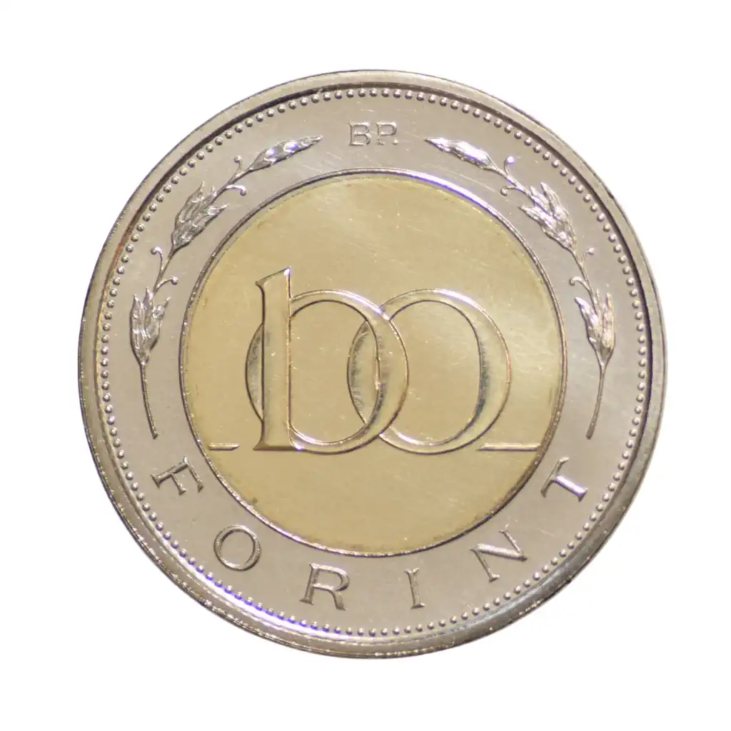 Rv: kissé egymásra csúsztatott számjegyekből álló, lent bal és jobb oldalon díszítővonallal ellátott „100” értékjelzés. Az oldal szélén futó gyöngysorszegély és belső körvonal között, fent „BP.” verdejel, lent „FORINT” félkörirat, melyeket két oldalt koszorúmotívum választ el egymástól.