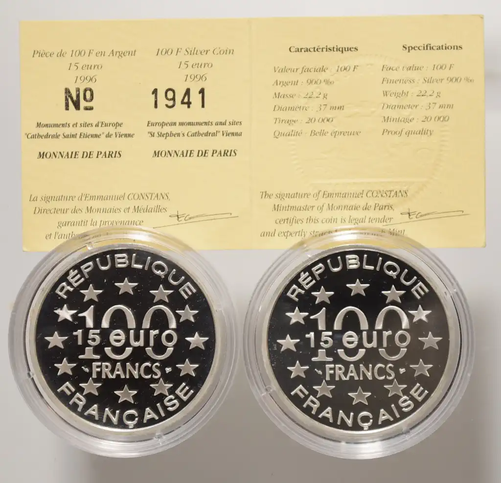 Megnevezés: 1996 Franciaország ezüst emlék 15 Euro (2 db)