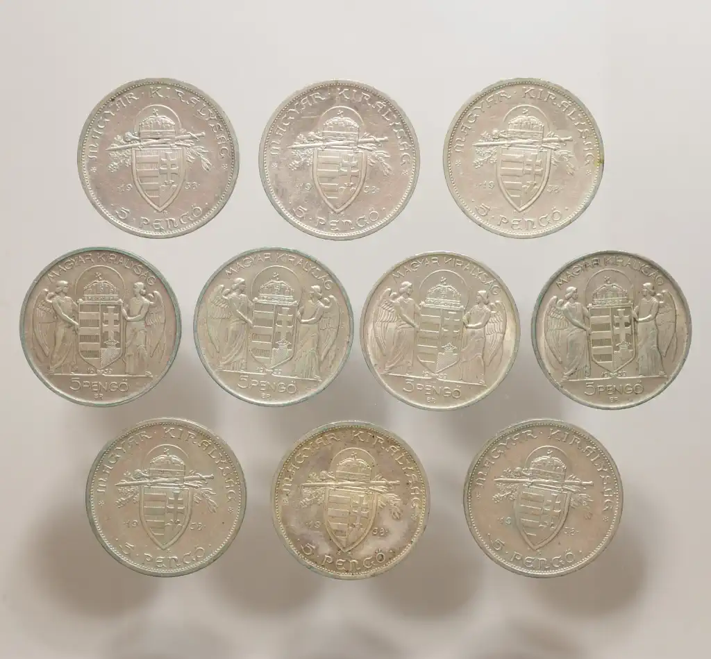 Megnevezés: 1938 / 39 ezüst 5 Pengő LOT (10 db)