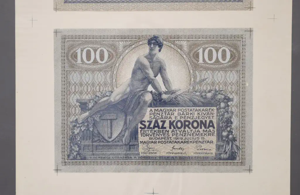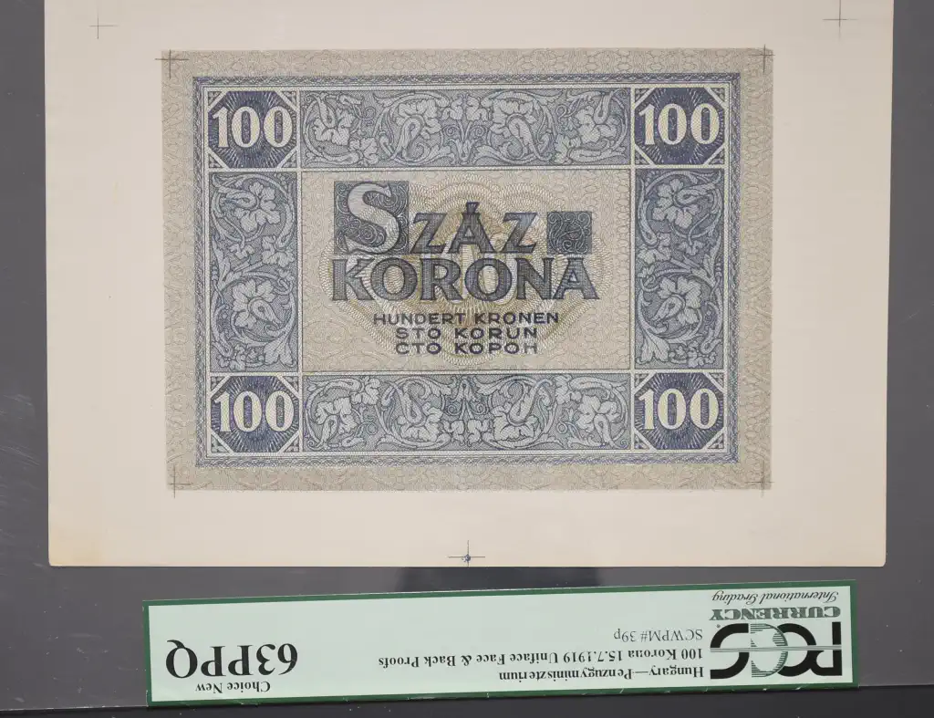 Megnevezés: 1919 Tanácsköztársaság 100 korona tervezet próba nyomat egy lapon PCGS63 minősítés (RRR!)